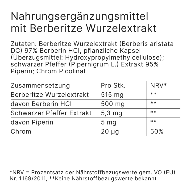 Gewonnen aus der Wurzel der Berberis aristata und hochdosiert mit 500 mg natürlichem Berberin pro Kapsel.