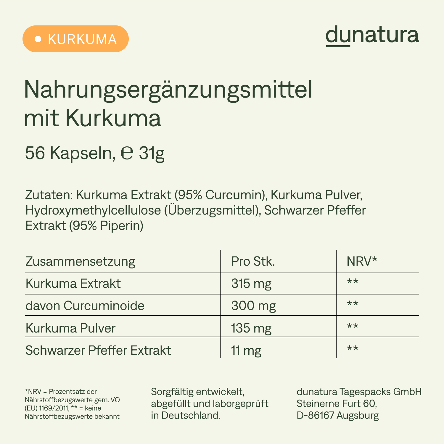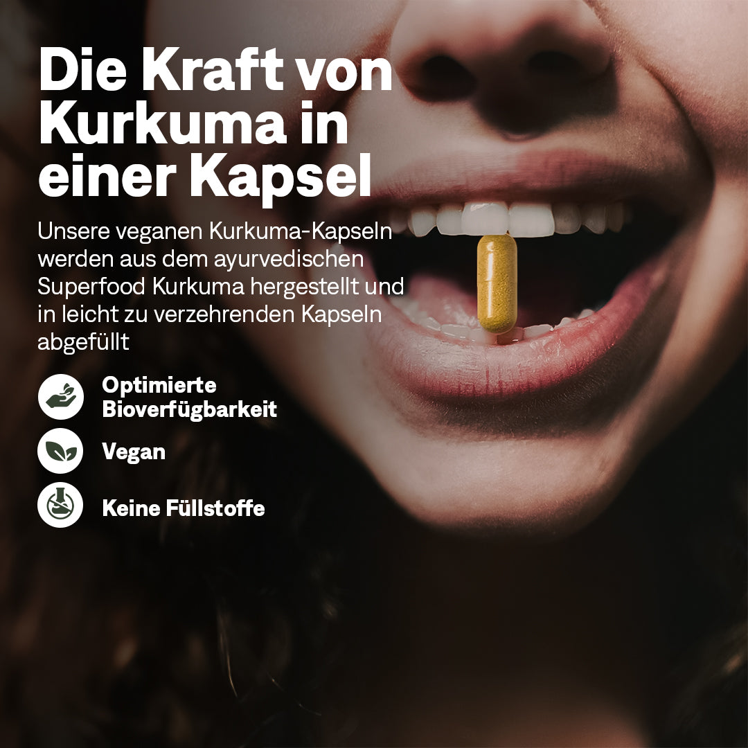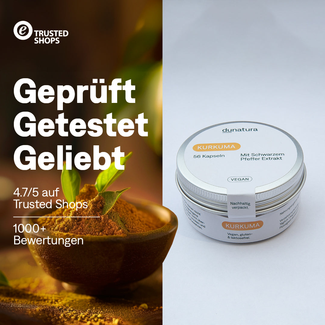 Kurkuma Extrakt gilt als wertvoller Pflanzenstoffe. Bereits seit Jahrhunderten wird Kurkuma traditionell verwendet. Unser hochkonzentriertes Kurkuma Extrakt enthält 95%iges Curcumin kombiniert mit naturbelassenem Kurkuma Pulver zur Erhaltung des vollen Spektrums aller Bestandteile einer natürlichen Kurkumawurzel. Optimal ergänzt mit Piperin für eine hohe Bioverfügbarkeit.
