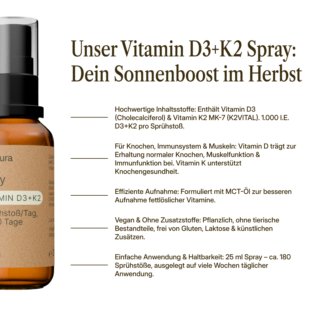 Vitamin D3 ist auch bekannt als das Sonnenvitamin. Diesen Namen trägt es, da der Körper es selbst aus dem Baustein Cholesterol herstellt. Doch der Organismus benötigt hierzu noch einen weiteren wichtigen Faktor: Sonnenlicht. Nur wenn genügend Oberfläche der Haut von UV Strahlung erreicht wird, findet diese Umwandlung unter der Haut statt. Durch unseren modernen Lebenswandel, der mehr und mehr ins Haus verlagert ist und den ausgeprägten Einsatz von UV-blockierender Sonnenmilch, erzeugen Menschen heutzutage immer weniger Vitamin D3 selbst. Besonders in der kalten Jahreszeit mit wenig Sonnenstunden, kann so leicht ein Vitamin D3 Mangel drohen. Vitamin D3 nimmt im menschlichen Körper eine Vielzahl von Funktionen ein. Die wohl wichtigsten und bekanntesten findet man im Bereich des Immunsystems, der Muskelfunktion und der Knochen. Vitamin D trägt zu einer normalen Funktion des Immunsystems, einer normalen Muskelfunktion und zur Erhaltung normaler Knochen bei. Bei einem ausgeprägten und langfristigen Mangel kann es in Folge in diesen Bereichen zu Störungen kommen. Wie alle Vitamine ist auch Vitamin D3 Teil eines komplexen Biomechanismus, der nicht isoliert sondern gemeinsam mit anderen Nährstoffen funktioniert. Für eine optimale Formulierung enthält unser Vitamin D3 zusätzlich Vitamin K2, das ebenfalls zur Erhaltung normaler Knochen beiträgt.