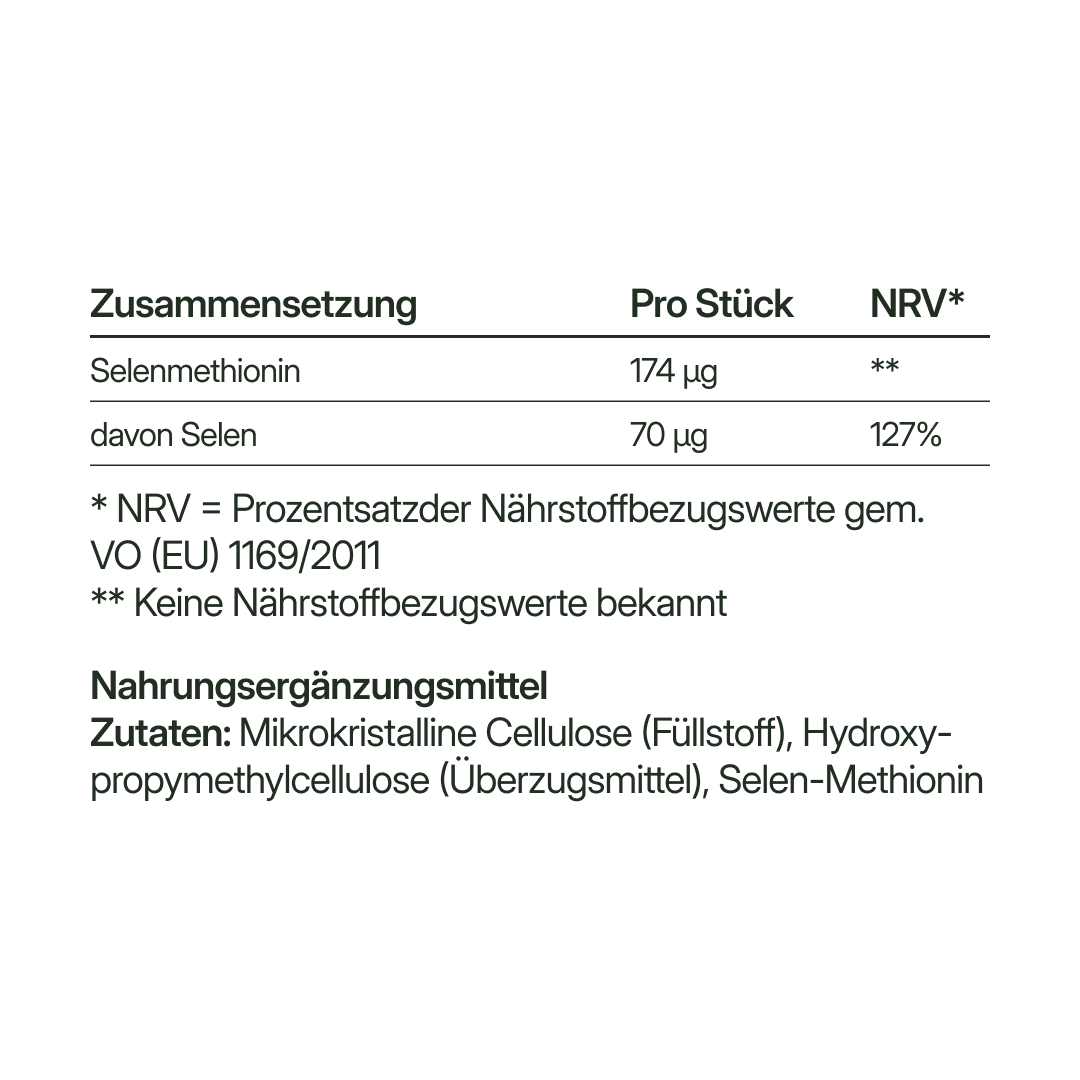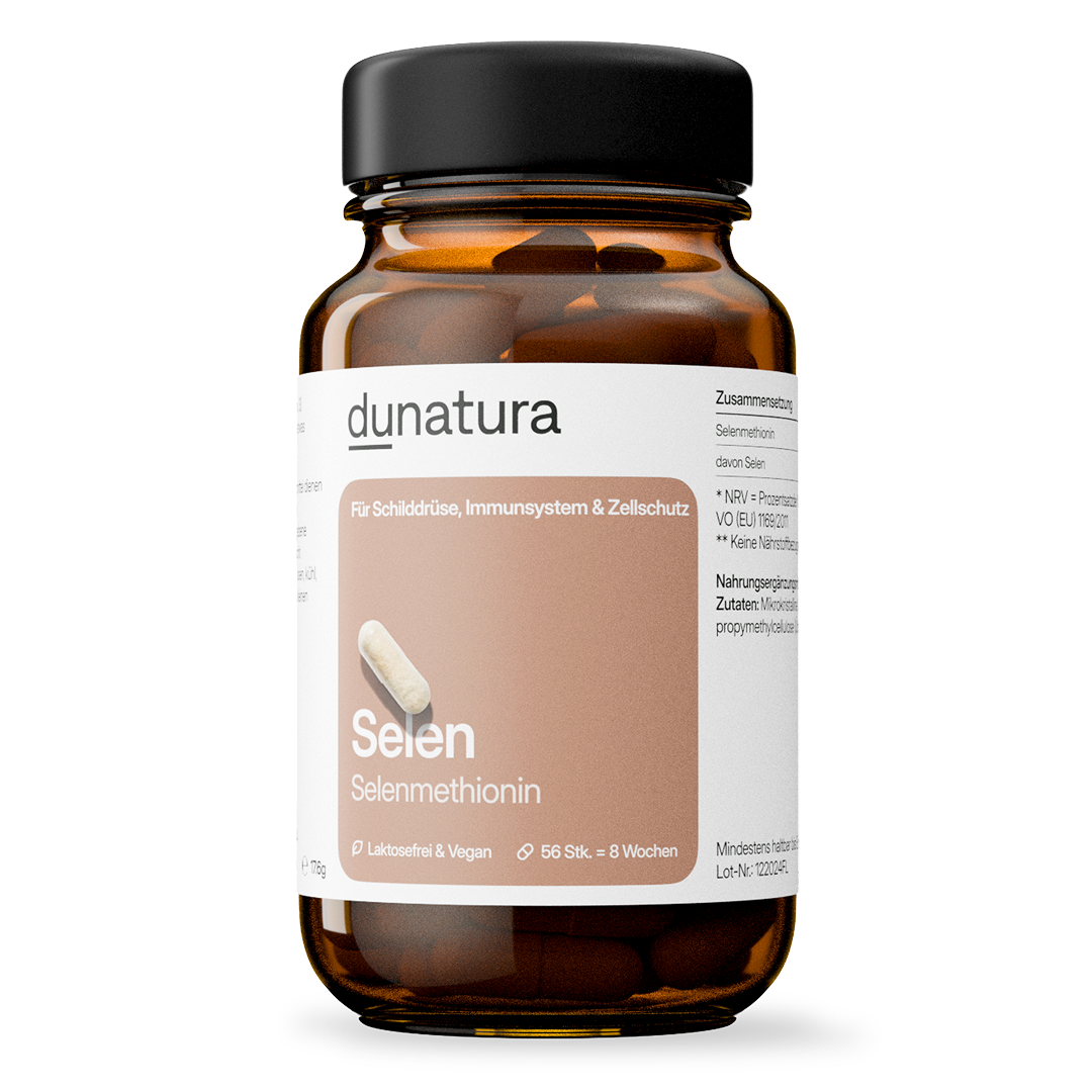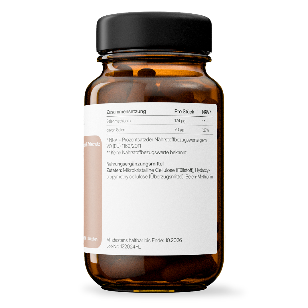 Selen ist ein essentielles Spurenelement, das zur normalen Funktion des Immunsystems, der Schilddrüse und zum Schutz der Zellen vor oxidativem Stress beiträgt. In Form von Selenmethionin – einer organisch gebundenen Verbindung – kann es besonders gut vom Körper aufgenommen werden. Jede Kapsel enthält 70 μg hochwertiges Selen. Unsere Kapseln sind vegan, frei von Zusatzstoffen und enthalten Selen in seiner besonders bioverfügbaren Form.
