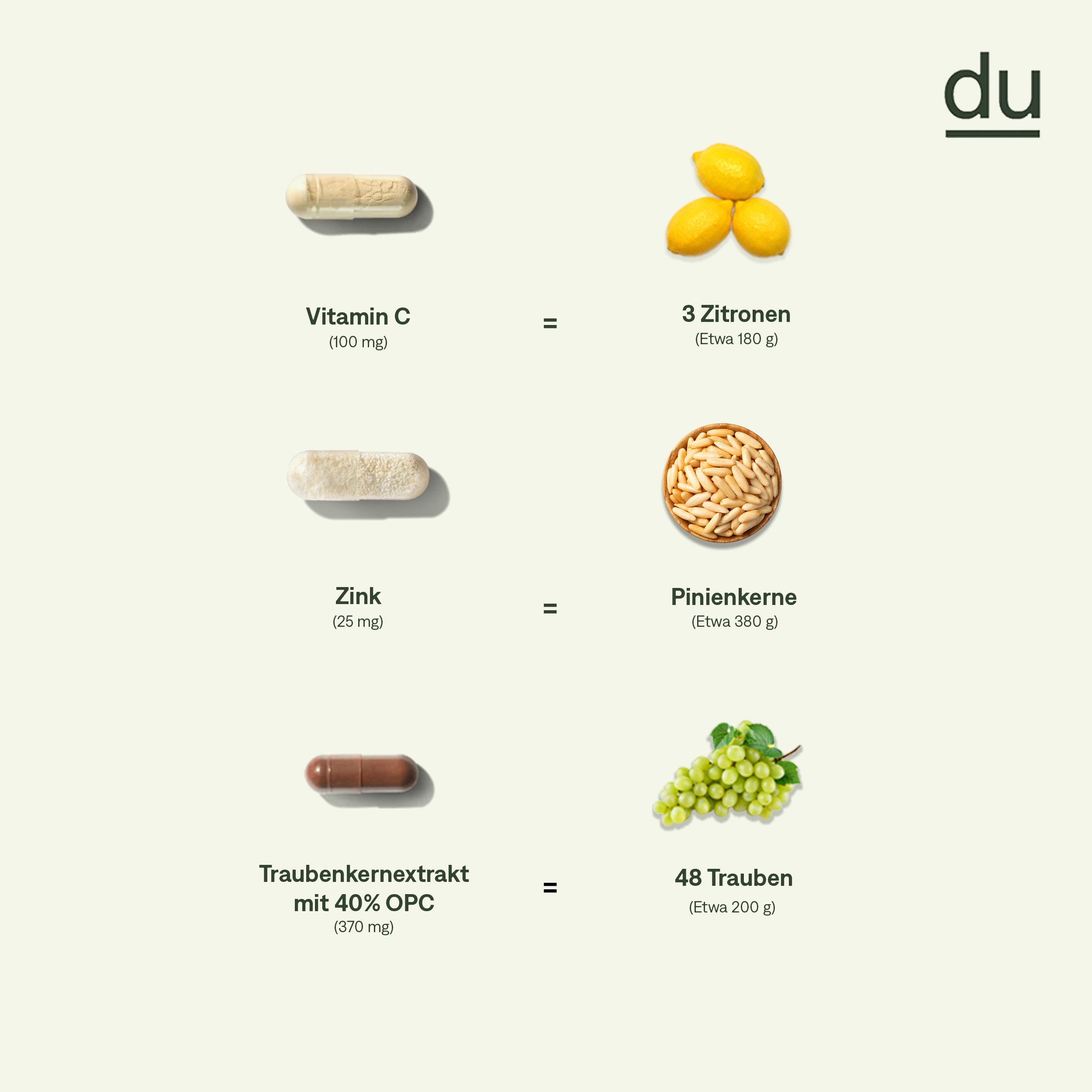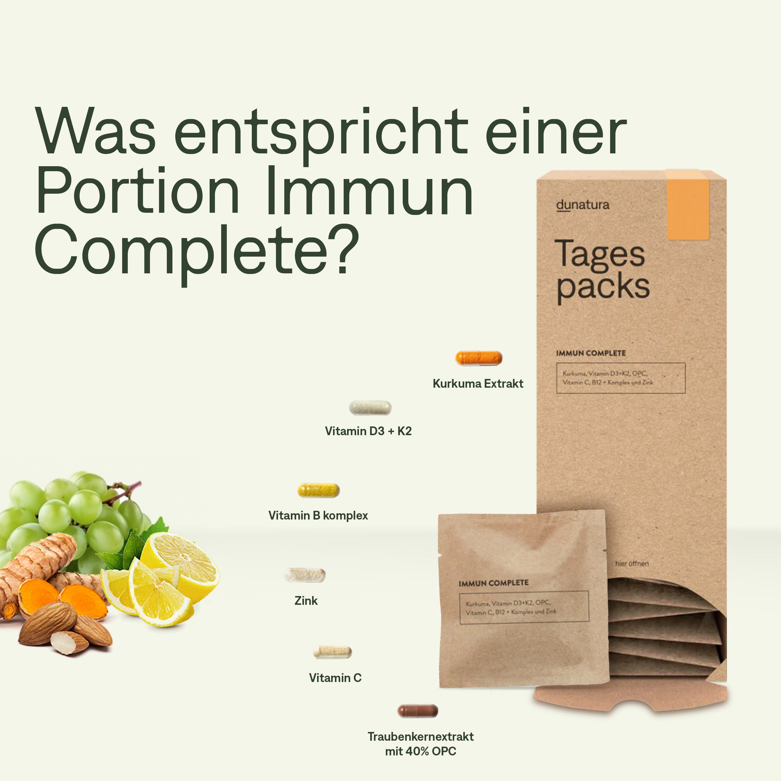 Für die Unterstützung des Immunsystems: Kombiniert ausgewählte Pflanzenstoffe (OPC, Kurkuma) mit Vitaminen (C, D3, B12, Folat, B-Komplex) und Zink. Diese Nährstoffe tragen zu einer normalen Funktion des Immunsystems bei. Ein Tower pro Monat, ein Tagespack pro Tag – einfach, praktisch und ohne unnötige Zusatzstoffe.