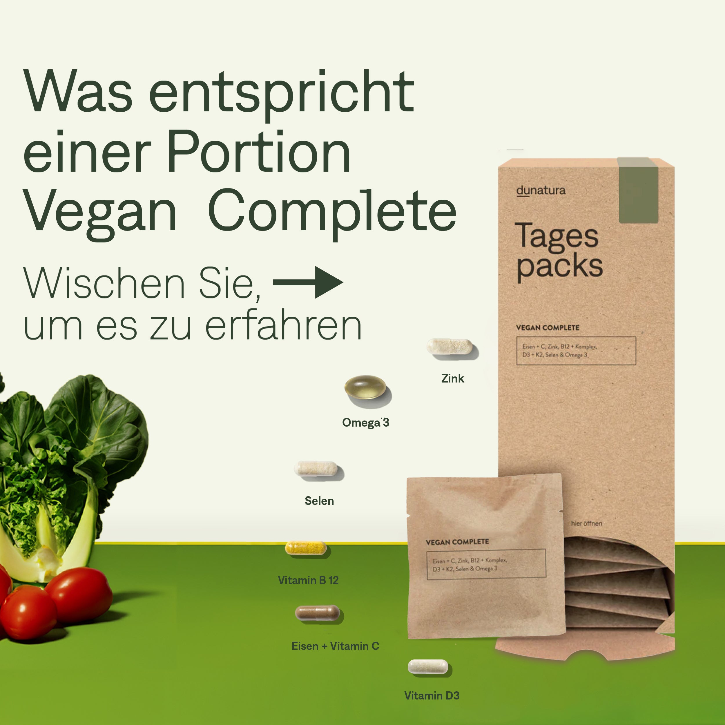 Für eine gezielte Nährstoffversorgung bei pflanzlicher Ernährung: Mit Vitamin B12, Eisen, D3, K2, C, Zink, Selen und Omega-3 aus Algenöl bietet dieses Tagespack eine ausgewogene Unterstützung für Immunsystem, Energiestoffwechsel und Zellschutz. Optimal abgestimmt für deine pflanzliche Ernährung. Ein Tower pro Monat, ein Tagespack pro Tag – einfach, praktisch und ohne unnötige Zusatzstoffe.